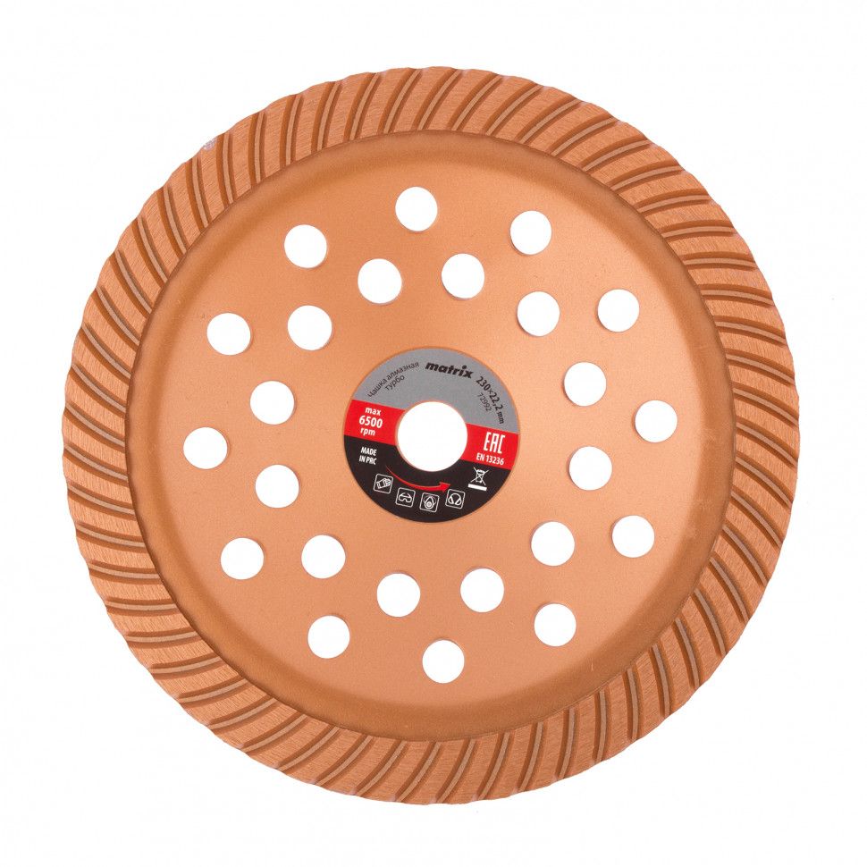 Алмазная зачистная чашка Matrix Turbo 72992 диаметром 230 мм устанавливается на вал углошлифовальной машины, для чего предусмотрено посадочное отверстие 22,2 мм. Используется для придания окончательной гладкости бетонным, каменным, мраморным, гранитным и кирпичным поверхностям, а также для снятия фаски на плитах из гранита или мрамора. Предназначена для профессионального применения. ПреимуществаВысокий ресурс — рабочий слой толщиной 6 мм характеризуется увеличенной плотностью алмазов и сбалансированной связкой. Работа без подачи воды — турбированная поверхность обеспечивает достаточное охлаждение. Быстрая и плавная шлифовка — чашка имеет увеличенную площадь соприкосновения с обрабатываемой поверхностью. Эффективность и долгий срок службы — в корпусе предусмотрены отверстия для отвода шлама и тепла. Устойчивость к воздействию влаги — стальной корпус покрыт эмалью для защиты от коррозии. Гарантированное качество — чашка произведена на специализированном заводе с соблюдением всех технологический требований.