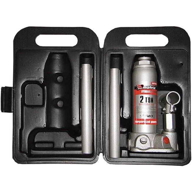 Домкрат гидравлический бутылочный Matrix 50750 предназначен для подъема грузов массой до 2 т на высоту от 181 до 345 мм. Оптимален для машин с большим клиренсом. Будет полезен автолюбителям при проведении технического обслуживания и ремонте авто в дороге или в гараже. Также домкрат подходит для полупрофессионального применения на станциях ТО. ПреимуществаЗащита от перегрузки — при превышении допустимой массы груза 2000 кг срабатывает клапан безопасности. Широкий диапазон применения — усиленный винт позволяет вручную увеличить высоту подъема на 60 мм. Надежность и долговечность — станина выполнена из чугуна, корпус — из высокопрочной стали, полированный шток увеличивает срок службы домкрата. Устойчивость к износу — благодаря трапециевидной резьбе увеличительный винт выдерживает многократное использование. Защита от коррозии — на корпус нанесено фосфатное покрытие. Разъемная резьбовая конструкция — при необходимости ремонта корпус можно снимать со станины. Высококачественное всесезонное масло — домкрат безотказно работает в широком диапазоне температур (от -20 до 45 ℃). Простое обслуживание — заменить масло можно самостоятельно, сняв пробку заливного отверстия. Эффективность — чугунная станина обеспечивает устойчивое положение домкрата, составная рукоятка позволяет проводить работы в ограниченном пространстве и компактно размещать устройство в зоне хранения. Удобное хранение и транспортировка — домкрат поставляется в прочном пластиковом кейсе с ручкой.