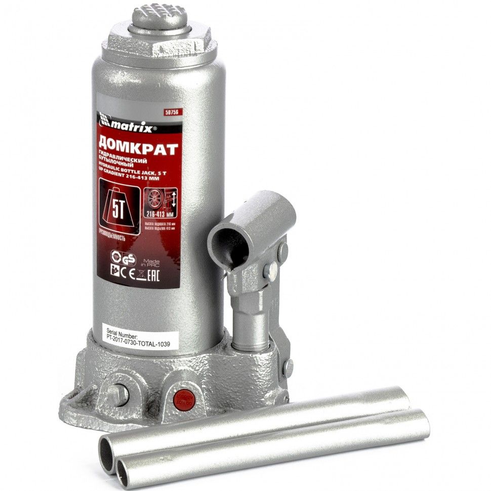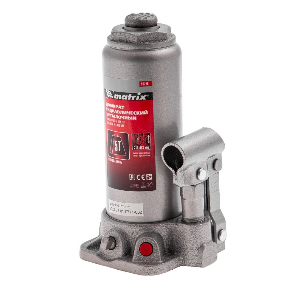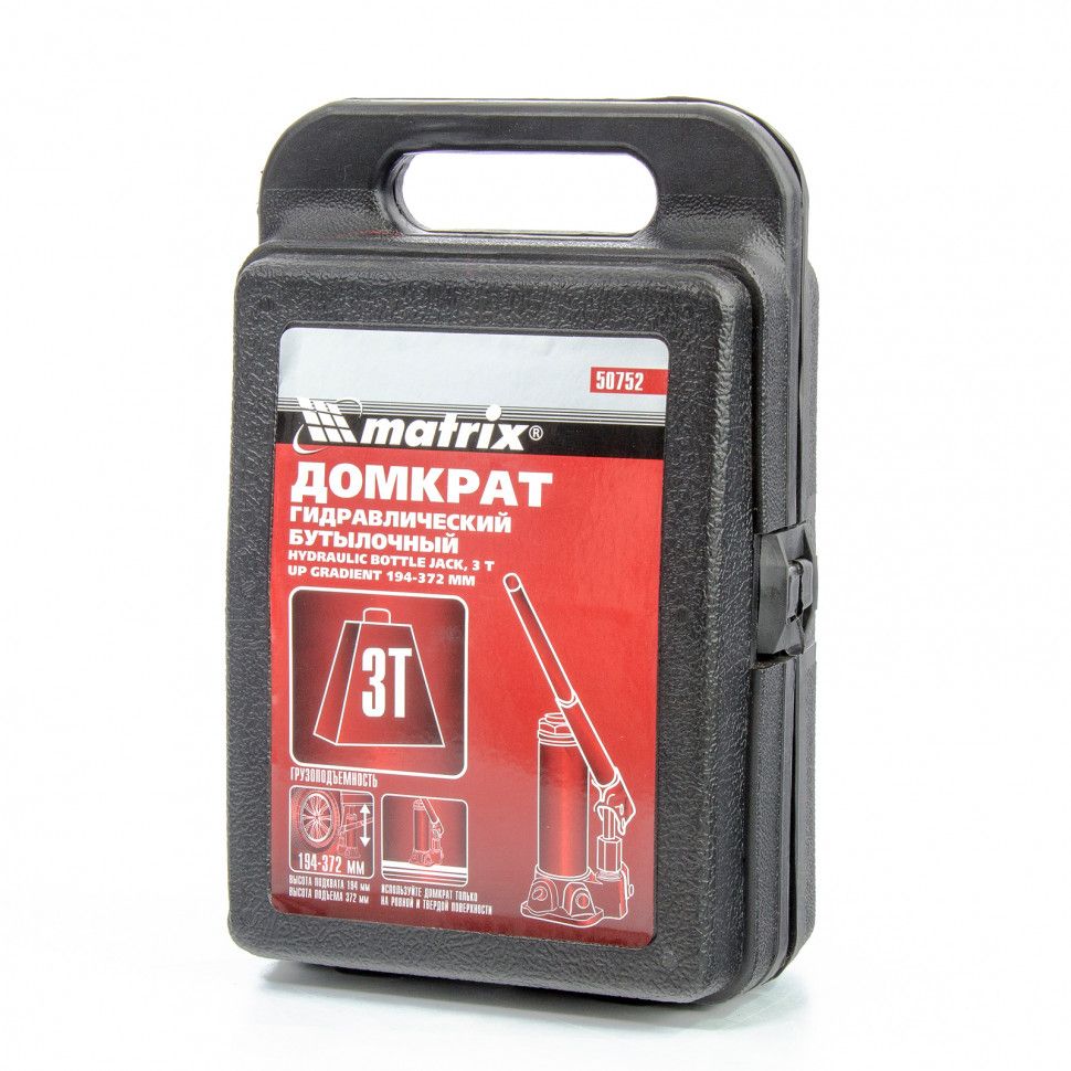 Домкрат гидравлический бутылочный Matrix 50756 предназначен для подъема грузов массой до 5 т на высоту от 216 до 413 мм. Оптимален для машин с большим клиренсом, поставляется в пластиковом кейсе. Будет полезен автолюбителям при проведении технического обслуживания и ремонте авто в дороге или в гараже. Также домкрат подходит для полупрофессионального применения на станциях ТО. ПреимуществаЗащита от перегрузки — при превышении допустимой массы груза 5000 кг срабатывает клапан безопасности. Широкий диапазон применения — усиленный винт позволяет вручную увеличить высоту подъема на 60 мм. Надежность и долговечность — станина выполнена из чугуна, корпус — из высокопрочной стали, полированный шток увеличивает срок службы домкрата. Устойчивость к износу — благодаря трапециевидной резьбе увеличительный винт выдерживает многократное использование. Защита от коррозии — на корпус нанесено фосфатное покрытие. Разъемная резьбовая конструкция — при необходимости ремонта корпус можно снимать со станины. Высококачественное всесезонное масло — домкрат безотказно работает в широком диапазоне температур (от -20 до 45 ℃). Простое обслуживание — заменить масло можно самостоятельно, сняв пробку заливного отверстия. Эффективность — чугунная станина обеспечивает устойчивое положение домкрата, составная рукоятка позволяет проводить работы в ограниченном пространстве и компактно размещать устройство в зоне хранения. Удобное хранение и транспортировка — домкрат поставляется в прочном пластиковом кейсе с ручкой.