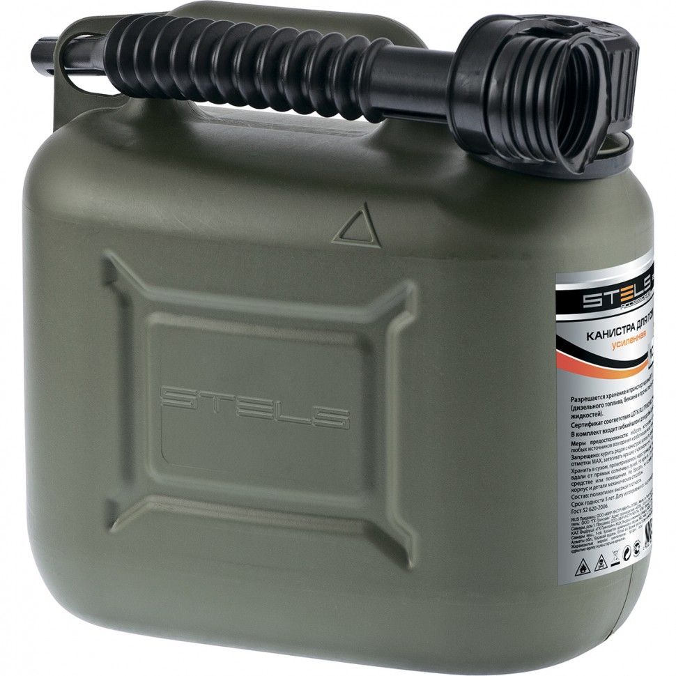 Усиленная пластиковая канистра Stels 53124 объемом 5 л, вертикальная, используется для транспортировки топлива и других ГСМ, а также их хранения в гараже или на даче. Будет полезна для дозаправки автомобиля в дороге. Также пригодится для обслуживания бензотехники: пил, триммеров, газонокосилок и другого оборудования. ПреимуществаДолгий срок службы — канистра усиленной конструкции изготовлена из маслобензостойкого пластика увеличенной толщины. Комфортное использование — специальный носик позволяет переливать бензин без риска испачкаться. Компактность — канистру удобно перевозить в багажнике легкового автомобиля.