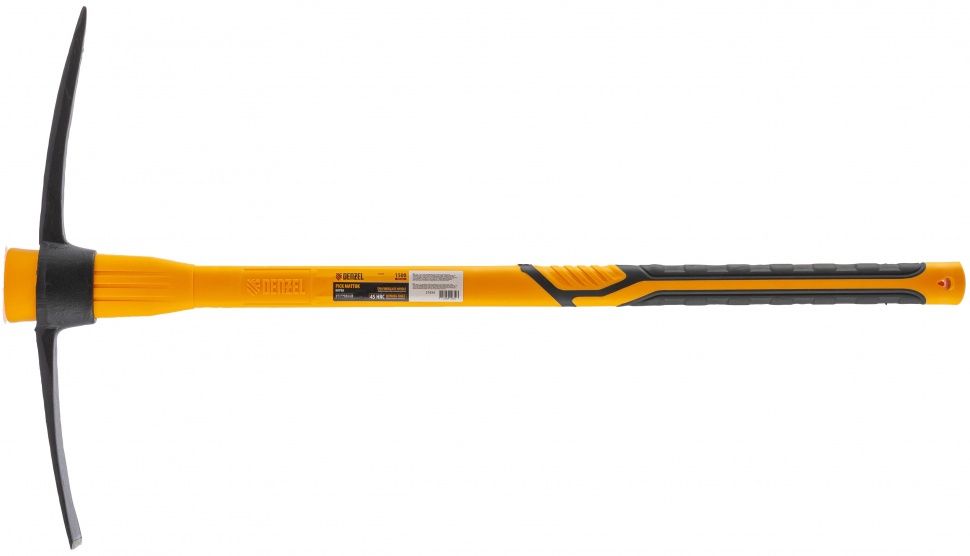 Кирка Denzel 21834 длиной 900 мм, с узкой рабочей частью, головой весом 1500 г и фибергласовой обрезиненной рукояткой, предназначена для работы по камню, рыхления каменистого, пересохшего земляного и глиняного грунта. Может использоваться для разрушения старой кирпичной кладки и колки льда. Инструмент будет полезен на строительной площадке и дачном участке. ПреимуществаПрочность — рабочая часть изготовлена из стали 65Mn методом ковки и выдерживает ударные нагрузки без риска появления трещин и сколов. Износостойкость — режущие кромки закалены до твердости 45 HRC и заточены. Надежная рукоятка — усиленный фибергласовый стержень значительно увеличивает ее прочность. Комфортная работа — места хвата обрезинены и имеют рельефную поверхность, поэтому рукоятка не выскальзывает из рук.
