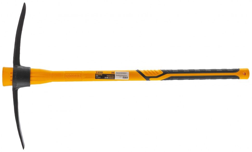 Кирка Denzel 21835 длиной 900 мм, с узкой рабочей частью, головой весом 2000 г и фибергласовой обрезиненной рукояткой, предназначена для работы по камню, рыхления каменистого, пересохшего земляного и глиняного грунта. Может использоваться для разрушения старой кирпичной кладки и колки льда. Инструмент будет полезен на строительной площадке и дачном участке. ПреимуществаПрочность — рабочая часть изготовлена из стали 65Mn методом ковки и выдерживает ударные нагрузки без риска появления трещин и сколов. Износостойкость — режущие кромки закалены до твердости 45 HRC и заточены. Надежная рукоятка — усиленный фибергласовый стержень значительно увеличивает ее прочность. Комфортная работа — места хвата обрезинены и имеют рельефную поверхность, поэтому рукоятка не выскальзывает из рук.