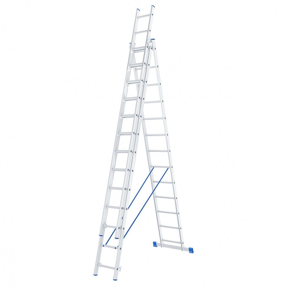 Алюминиевая трехсекционная лестница Сибртех 97823 состоит из 3 секций по 13 ступеней каждая. Она предназначена для использования преимущественно на открытом воздухе и в помещениях с высокими потолками, подойдет также для работников коммунальных служб и строителей. Лестница поможет провести отделочные, монтажные работы, будет полезна на складе. ПреимуществаНадежность и долговечность — рама изготовлена из прессованного алюминиевого профиля прямоугольного сечения, весит намного меньше стальных аналогов, при этом обладает прочностью и коррозионной стойкостью. Допустимая нагрузка 150 кг — лестница способна выдержать вес практически любого пользователя. Многофункциональность — лестница может использоваться в 3 различных вариациях — в качестве стремянки (с двумя расставленными и одной выдвинутой вверх секцией), двухсторонней стремянки (две секции расставлены, третья демонтирована) и приставной лестницы. Пластиковые заглушки — края профиля не царапают напольное покрытие независимо от выбранного положения лестницы. Устойчивость — лестница оснащена съемным стабилизатором, выравнивающим ее положение на горизонтальных поверхностях. Безопасная эксплуатация — на ступени нанесено антискользящее покрытие, имеется ограничитель по максимальной высоте. Простое применение — сборка, разборка и смена рабочих положений не занимает много времени. Компактное хранение и удобная транспортировка — в сложенном виде лестница не занимает много места. Внешний вид товара может незначительно отличаться от указанного на изображении, что не влечет изменения его качества.