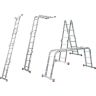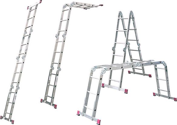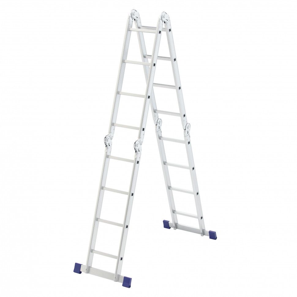 Шарнирная алюминиевая лестница Сибртех 97882 представляет собой 4 секции по 4 ступени, которые можно настроить в нескольких рабочих положениях. Она может использоваться в качестве приставной лестницы, двухсторонней стремянки и помоста. Будет полезна как в быту, так и на небольших стройках, в гараже и магазинах. ПреимуществаШирокие траверсы — лестница устойчиво фиксируется на горизонтальной поверхности в любом рабочем положении. Противоскользящее рифление на ступенях — пользоваться лестницей безопасно, нога не соскользнет в процессе выполнения работ. Сочетание легкости и прочности — рама изготовлена из прессованного алюминиевого профиля прямоугольного сечения, выдерживает нагрузку до 120 кг. Надежные шарнирные механизмы — лестница не шатается в рабочих положениях, смена рабочих положений происходит быстро и легко. Габариты в сложенном состоянии 1220 х 340 х 280 мм — лестницу удобно хранить и транспортировать.