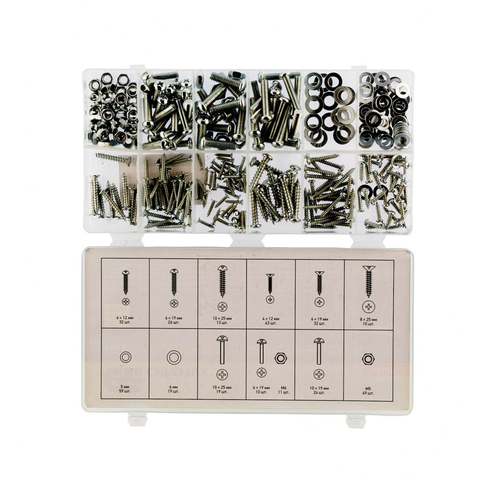 Набор Сибртех 47609 состоит из 347 предметов и включает саморезы с диаметром резьбы от 4 до 8 мм и длиной от 12 до 25 мм, а также гайки М5-М6, шайбы 5 и 6 мм и винты 10 х 25 мм, 6 х 19 мм, 10 х 19 мм. Крепежные элементы предназначены для создания надежных резьбовых соединений и используются для сборки мебели, техники, монтажа оборудования, проведения сантехнических работ, а также в автомобилестроении. Также будут полезны дома или на даче. ПреимуществаЭффективное решение разнообразных задач — в набор входят крепежные изделия различных типов и наиболее распространенных размеров. Прочность и долговечность — крепеж изготовлен из твердой стали и оцинкован для защиты от коррозии. Удобное хранение и транспортировка — набор упакован в пластиковый кейс с 12 отсеками.