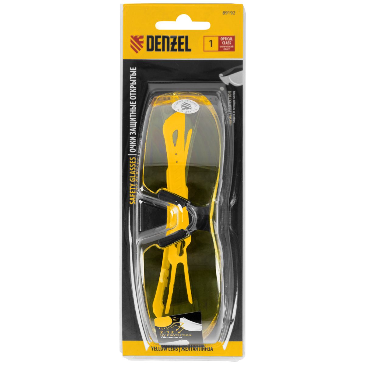 Легкие универсальные защитные очки открытого типа Denzel 89192 с поликарбонатными желтыми линзами и 2-компонентными дужками предназначены для защиты глаз от механических повреждений и УФ-излучения. Очкам присвоен класс механической прочности F, они обеспечивают защиту от высокоскоростных частиц с низкоэнергетическим ударом V=45 м/с. Очки используются во время работы с электро- и бензоинструментом, на производстве и в быту. ПреимуществаОтличная видимость – на линзы нанесено двустороннее твердое незапотевающее покрытие в соответствии с ГОСТ 12. 4. 309. 2-2016. Высокие эксплуатационные свойства — линзы из высокопрочного поликарбоната имеют оптический класс 1 и подходят для длительного ношения. Желтые линзы — очки обеспечивают хорошую контрастность предметов в условиях тумана, дымки или слабого освещения. Оптимальная посадка — мягкий носовой упор и гибкие дужки из современных материалов не давят и не натирают кожу. Комфортная работа — в дужках предусмотрены отверстия под шнурок. Высокое качество — характеристики очков соответствуют требованиями ТР ТС 019/2011, что подтверждает соответствующий сертификат.