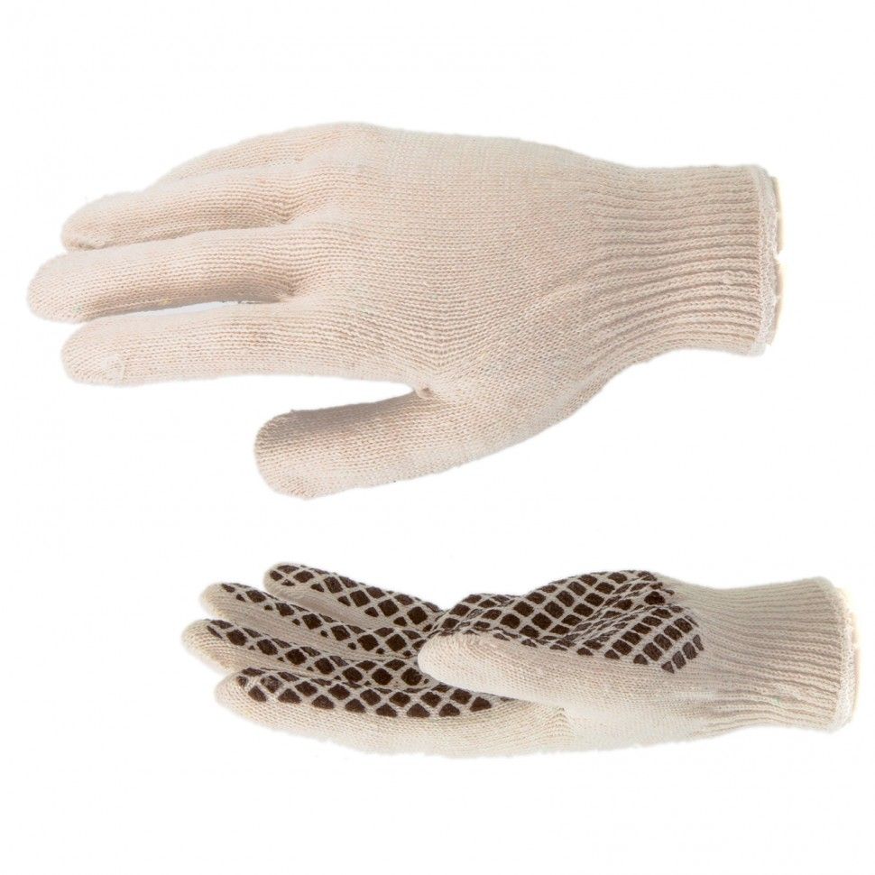 Трикотажные перчатки Сибртех 67779 с рисунком из ПВХ-геля «Шахматный облив», обработанные оверлоком, предназначены для защиты рук от травм и загрязнений. Тонкое полотно 10 класса вязки сохраняет чувствительность пальцев, необходимую для выполнения точных работ. Гелевое ПВХ-покрытие препятствует выскальзыванию инструментов и различных деталей. Перчатки используются при проведении строительных, монтажных, механосборочных, автослесарных работ, также будут полезны в быту. ПреимуществаКомфорт во время работы — натуральная хлопчатобумажная основа обеспечивает хороший воздухообмен, поэтому руки не потеют. Прочность и эластичность — в пряжу добавлена полиэфирная нить, устойчивая к разрыву. Долговечность — покрытие из ПВХ-геля предохраняет изделия от истирания, а края манжет обработаны оверлоком, что повышает их износостойкость. Свобода движений — перчатки удобно садятся по руке. Надежная фиксация на кистях рук — эластичные манжеты плотно облегают запястья, препятствуя сползанию перчаток. Безопасность — материал перчаток не вызывает аллергии и безвреден для здоровья.