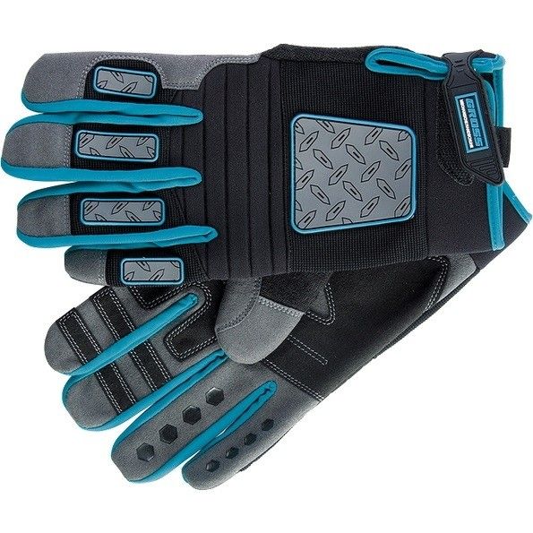 Универсальные усиленные перчатки Gross DELUXE 90325 с защитными накладками, размера L (9), служат для защиты рук от механических повреждений и образования мозолей. Тонкие и износостойкие защитные накладки из ПВХ на тыльной стороне ладони и пальцах дополнительно предохраняют руки от механических повреждений. Формованные накладки на ладонях препятствуют появлению синяков и ссадин. Изделия могут использоваться при проведении строительных и ремонтных работ, а также во время занятий спортом или активного отдыха. ПреимуществаНадежный захват — дополнительные элементы на поверхности пальцев обеспечивают надежный захват скользких предметов. Удобная посадка — гибкие манжеты с застежкой типа velcro предотвращают сползание перчаток. Повышенная эластичность — перчатки плотно облегают кисти рук и не сковывают движения пальцев. Комфортная работа — благодаря сетчатой вставке руки не потеют, а специально разработанные швы Ergonomic Cut не натирают кожу ладоней.