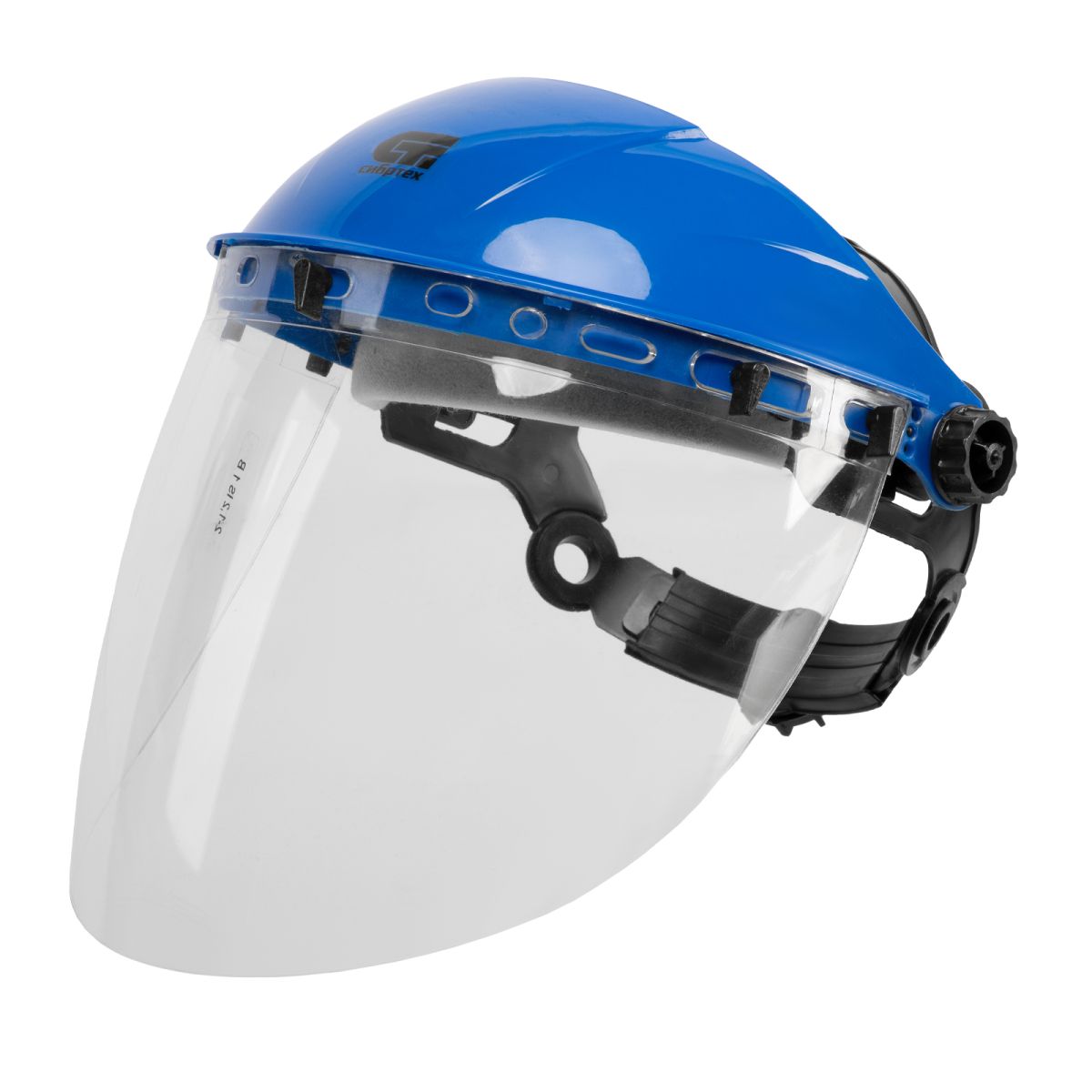 Защитный щиток Сибртех 89124 типа НБТ, размером 400 х 220 мм, из оптически прозрачного поликарбоната, имеет увеличенный экран и закрывает лицо рабочего, предохраняя его от искр, брызг неразъедающих жидкостей, а также твердых летящих частиц с высокой кинетической энергией до 14,9 Дж. Прозрачный экран, мягкий налобный обтюратор и регулируемое оголовье обеспечивают комфорт во время длительного ношения. Изделие используется во время строительных, токарных, слесарных работ. ПреимуществаДолговечность — защитный экран обладает механической прочностью класса А и рассчитан на длительную эксплуатацию. Надежная посадка даже на головной убор — реечный механизм позволяет плавно отрегулировать теменную и налобную ленты. Защита верхней части головы — щиток имеет козырек из противоударного термостойкого пластика. Продуманная конструкция — в щитке можно работать, не снимая респиратор или корригирующие очки. Эргономичность — экран скошен книзу и не мешает повороту и наклону головы. Комфортная работа — угол наклона можно отрегулировать, придав экрану удобное положение или откинув его наверх.