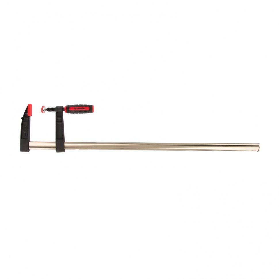 F-образная струбцина Matrix 20408 размером 800 х 120 х 900 мм используется для зажима металлических, деревянных и других заготовок для их последующей обработки или сборки. Представляет собой штангу, на которой установлено 2 кронштейна — неподвижный и подвижный. Деталь помещается между ними и прижимается к губкам при помощи винтового зажима с трапециевидной резьбой. Подвижный кронштейн позволяет регулировать величину захвата, которая может достигать 800 мм. Струбцину применяют для выполнения слесарных и столярных работ. ПреимуществаНадежность — стальная штанга выдерживает повышенные нагрузки и позволяет фиксировать заготовки со значительным усилием. Аккуратная работа — пластиковые накладки на губках предотвращают повреждение детали при сжатии. Возможность использования для сварочных работ — металлическая конструкция выдерживает высокую температуру (перед началом сварки необходимо снять пластиковые накладки с губок). Эргономичность — двухкомпонентная обрезиненная рукоятка с рельефным дизайном не выскальзывает из ладони.