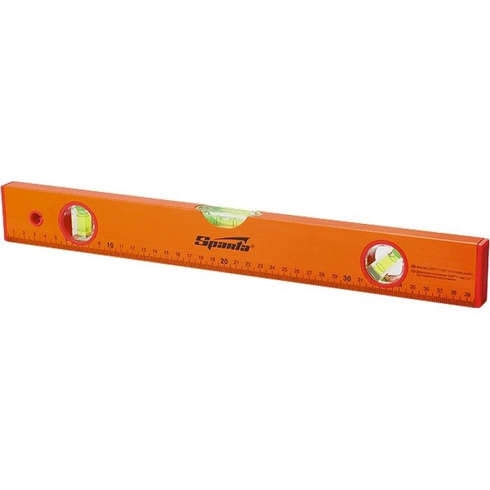 Алюминиевый уровень Sparta 330295 длиной 1000 мм, желтого цвета, с 3 глазками и линейкой, будет полезен при проведении строительных, отделочных, облицовочных и других работ, требующих особой точности. Уровень с тремя глазками поможет определить отклонение от горизонтальной и вертикальной плоскости, выставить угол 45°, измерить предметы и т. д. ПреимуществаНадежность — уровень изготовлен из алюминиевого профиля. Защита от пыли и строительного мусора — инструмент снабжен торцевыми заглушками. Функциональность — благодаря измерительной шкале можно начертить линию нужной длины. Точность выполняемых измерений — погрешность составляет 1 мм/м (0,057°). Для определения отклонения от вертикали 90° необходимо использовать пузырьковую ампулу только в верхнем положении уровня. Только базовая поверхность (противоположная ампуле 180°) является рабочей.