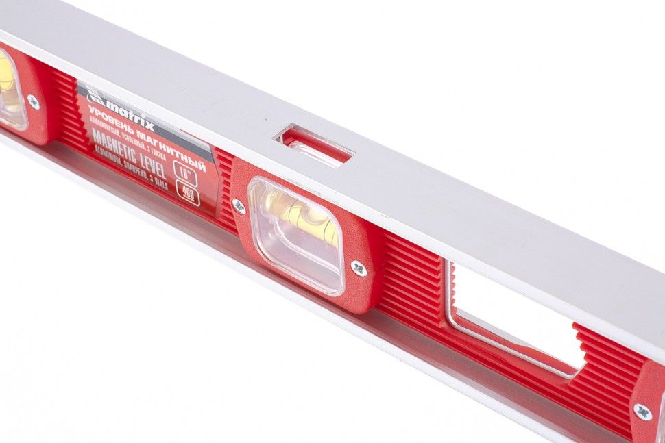 Магнитный уровень Matrix 33701 длиной 460 мм, с 3 глазками, — измерительный инструмент для проверки горизонтальных и вертикальных поверхностей. Пригодится на строительной площадке или в быту для выравнивания поверхностей, при монтаже конструкций, отделке помещений и выполнении других операций. Погрешность не превышает 1 мм на каждый метр (0,057°). ПреимуществаНадежная конструкция — корпус выполнен из пластмассы и легкого, но прочного алюминиевого каркаса. Удобная фиксация на металлических поверхностях — уровень снабжен встроенными магнитами. Защита от пыли и мелкого мусора — на торцах корпуса имеются пластиковые заглушки. Эргономичность — благодаря отверстию в корпусе уровень удобно удерживать. Для определения отклонения вертикали 90° необходимо использовать пузырьковую ампулу только в верхнем положении уровня. Только базовая поверхность (противоположная ампуле 180°) является рабочей.